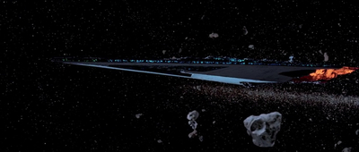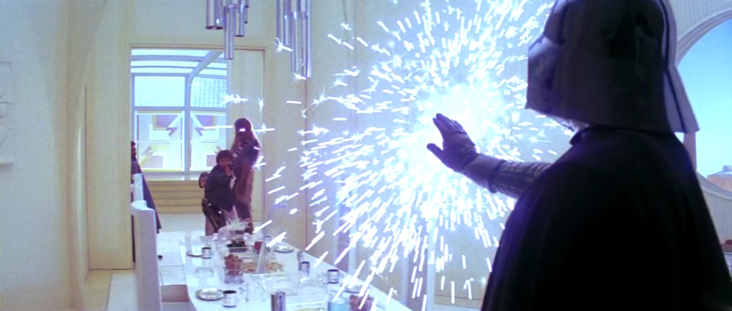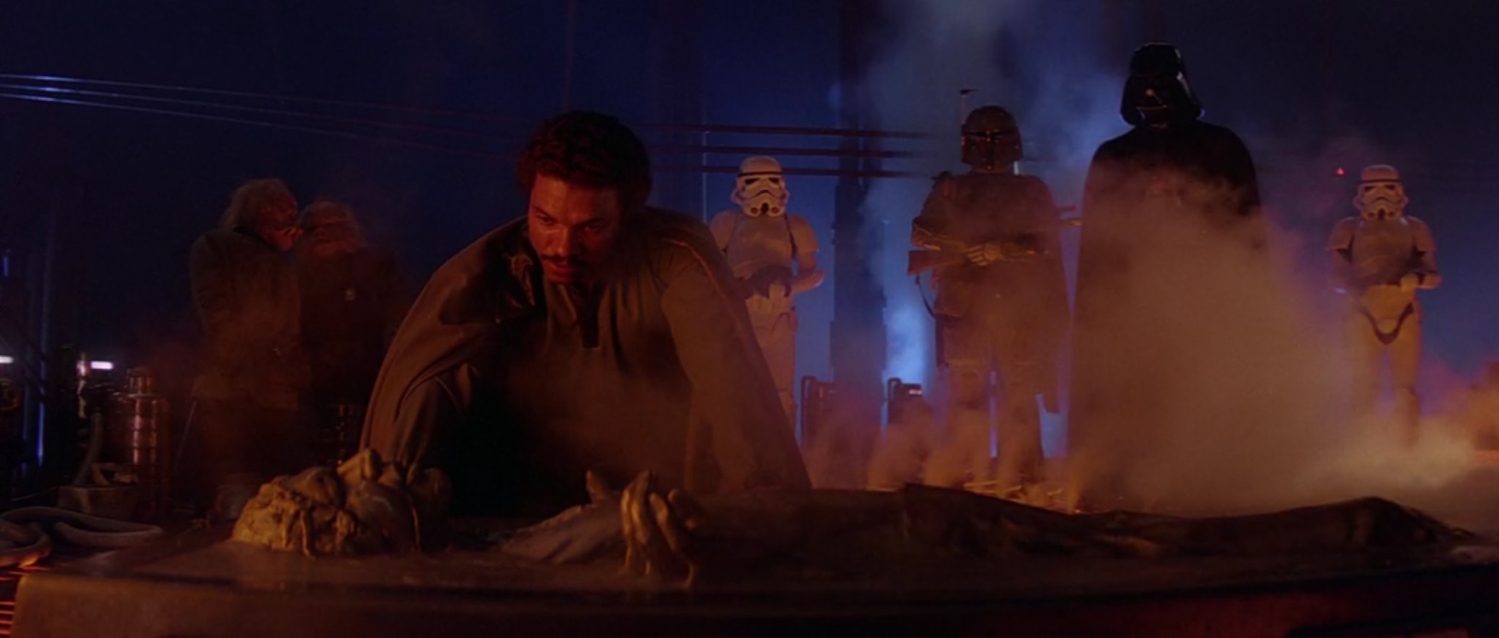 Лендо Калріссіан перевіряє стан свіжомороженого Гана Соло. Дарт Вейдер і Боба Фетт чекають на результат.