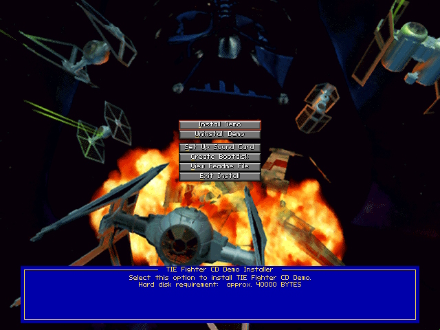 TIE Fighter (Chrysler-Plymouth Virtual Auto Plaza)Дана демонстраційна версія гри Star Wars: TIE Fighter містить 1 рівень гри з видання Collector's Edition, який повністю відповідає завданню 5. Охорона переозброєння, другої Битви. Більше деталей про цей рівень ви можете дізнатися тут. © Big Erny |